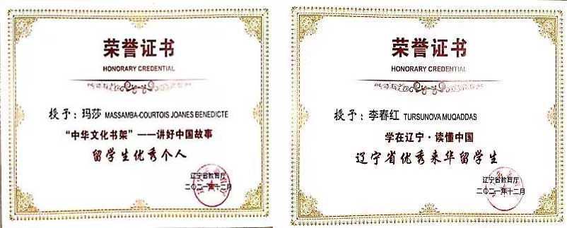 为进一步贯彻落实习近平总书记给北京大学留学生重要回信精神,不断提高来华留学工作质量水平,树立和表彰在来华留学工作、中外人文交流、疫情防控等工作中涌现的先进集体和个人,辽宁省教育厅关于评选2021年度辽宁省来华留学教育先进单位先进个人工作于2021年9月启动,经过全省各高校选送推荐、专家领导研究评审,辽宁省教育厅于近日公布了《关于通报表扬2021年“学在辽宁.读懂中国”来华留学先进集体和先进个人的通知》,我校来华留学生玛莎(MASSAMBA-COURTOIS JOANES BENEDICTE)、李春红(TURSUNOVA MUQADDAS)凭借在学业和日常生活中的优异表现以及在促进中外交流方面的突出贡献,分别荣获“‘中华文化书架’——讲好中国故事”留学生优秀个人、以及“学在辽宁.读懂中国”辽宁省优秀来华留学生荣誉称号。