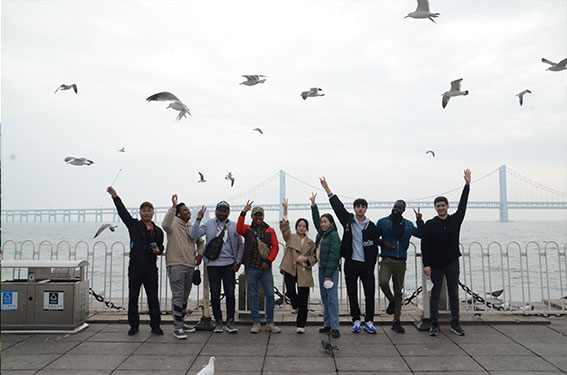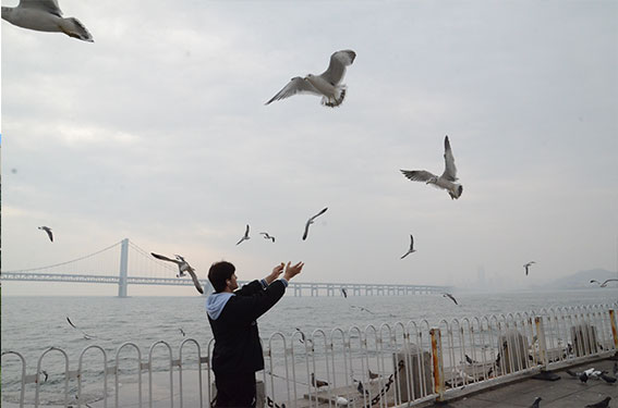 走出现代博物馆,同学们来到大连市的标志建筑之一星海广场。走进海岸边,驻足远眺,美景尽收眼底,朦胧的水雾给跨海大桥蒙上了一层神秘的面纱,成群结队的海鸥相互追逐、欢乐飞翔。同学们将准备好的食物抛向空中,引得海鸥纷纷飞来,鸥群翩翩、海岸连绵,大家把思绪从历史中抽离回来,在大海与自然的怀抱中得到无比的放松与自由。