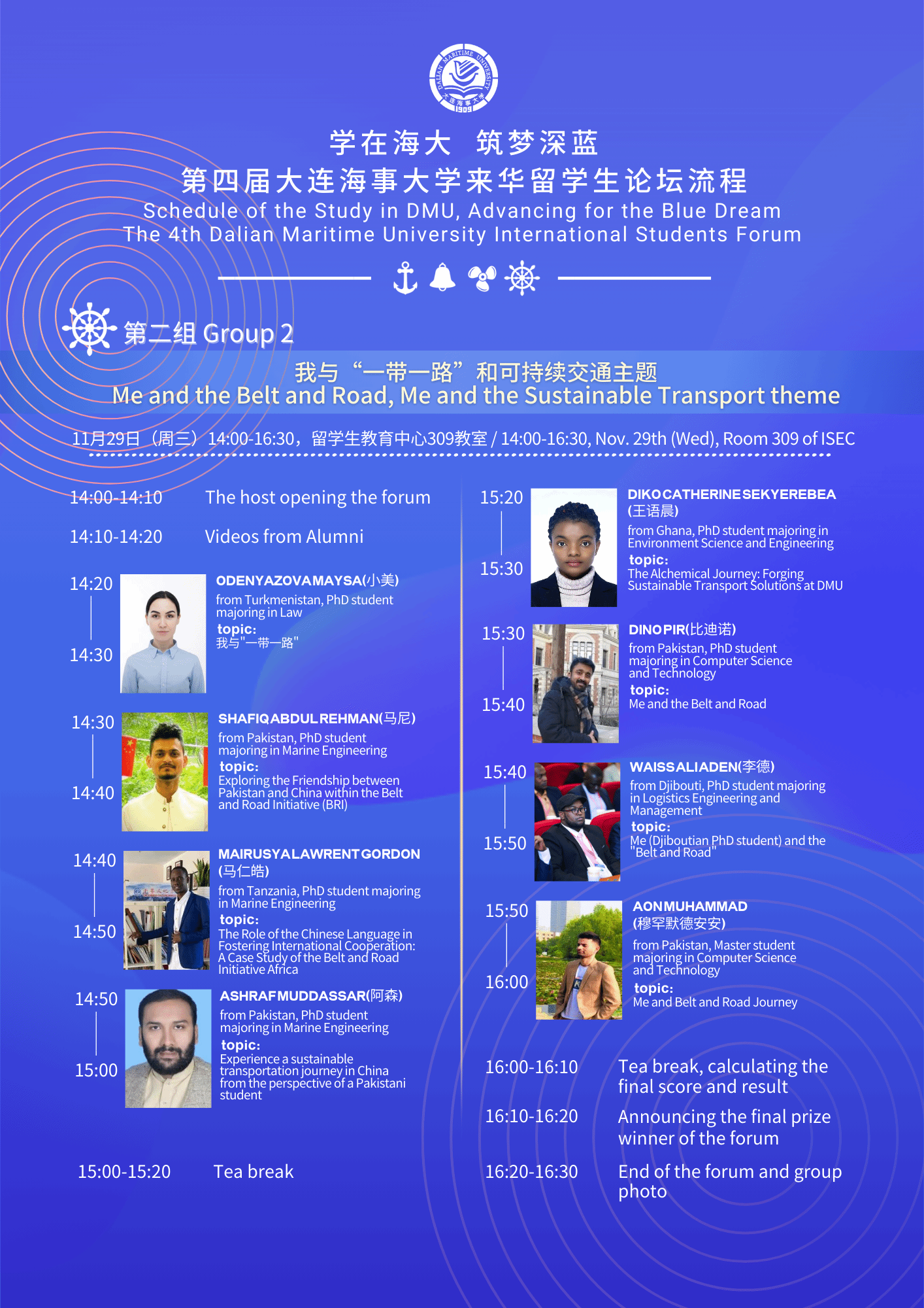 为了给海大来华留学生提供交流分享、互学互鉴的机会,为留学生搭建展示自己、锻炼能力的舞台,鼓励留学生积极讲述自己与“一带一路”的故事、表达对交通可持续发展的看法和畅想、或者分享留学海大的收获与成长,展示海大留学生良好的精神风貌、及其对构建人类命运共同体的使命感和责任感,“学在海大、筑梦深蓝——第四届大连海事大学来华留学生论坛”即将于11月29日举行。经过前期投稿、审核,共有16名来华留学生入围此次论坛,具体信息和安排如下:
