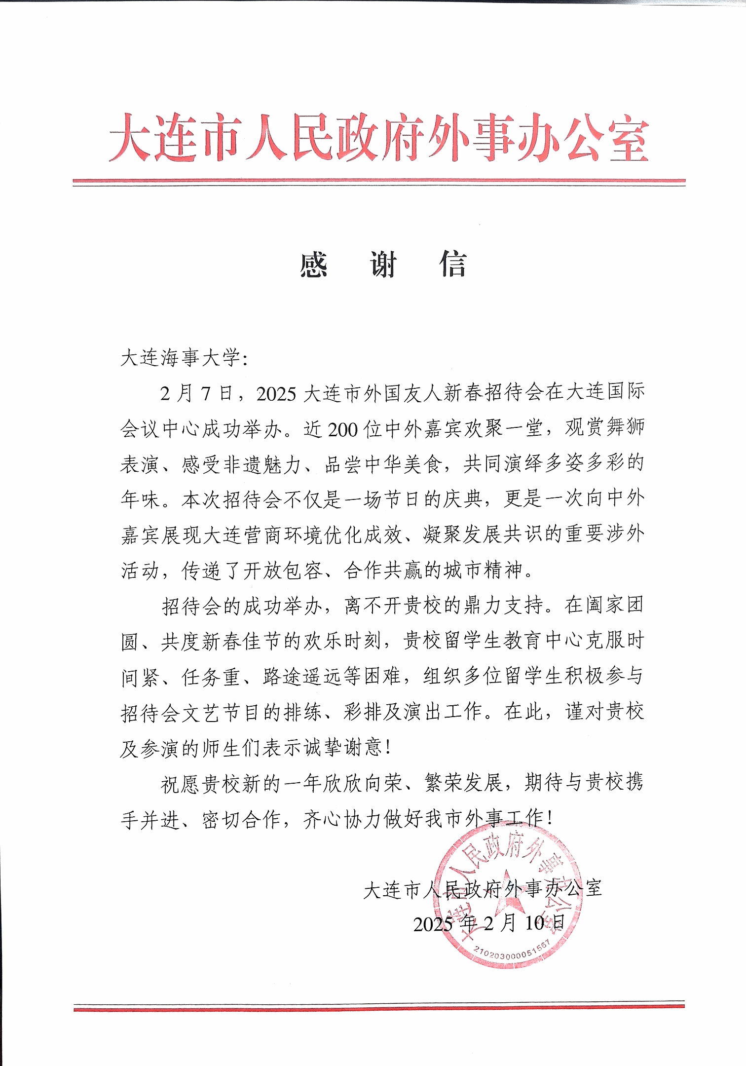 此次新春招待会的成功举办,不仅体现了大连市政府牢记嘱托、感恩奋进,携手广大国际友人以高水平开放赋能高质量发展、共同书写大连“两先区”高质量发展的坚定决心,还为外国友人提供了进一步了解和感受中国传统文化、增进文化认知和情感共鸣的良好契机,为促进中外文化互鉴和交流合作搭建起友谊的桥梁。此次是我校留学生连续第二年受邀参加大连市外国友人新春招待会并倾情献唱。同学们的精彩表现,良好展现了海大在培养知华、友华、爱华国际人才方面的突出成果,大连市人民政府外事办公室特发来感谢信对学校参演师生给予肯定和赞扬。未来,留学生教育中心将继续以服务区域经济建设和社会高质量发展为使命,通过吸收和培养更多高水平国际人才,向世界展示更加开放的大连,为北方明珠大连建设为“内畅外联的高水平开放门户枢纽”助一臂之力。