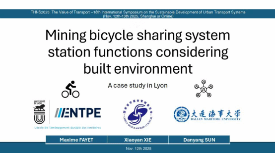 2025年11月12-13日,我校2025年短期科研交流项目(以下简称CHINA LINK项目)法国籍留学生FAYET MAXIME在上海参加了由同济大学、法国理工学院国立桥路学校主办的第十八届国际可持续发展城市交通系统研讨会(THNS论坛),并将其访问科研工作成果在会上作了题为《MINING BICYCLE SHARING SYSTEM STATION FUNCTIONS CONSIDERING BUILT ENVIRONMENT:A CASE STUDY IN LYON》的学术报告。