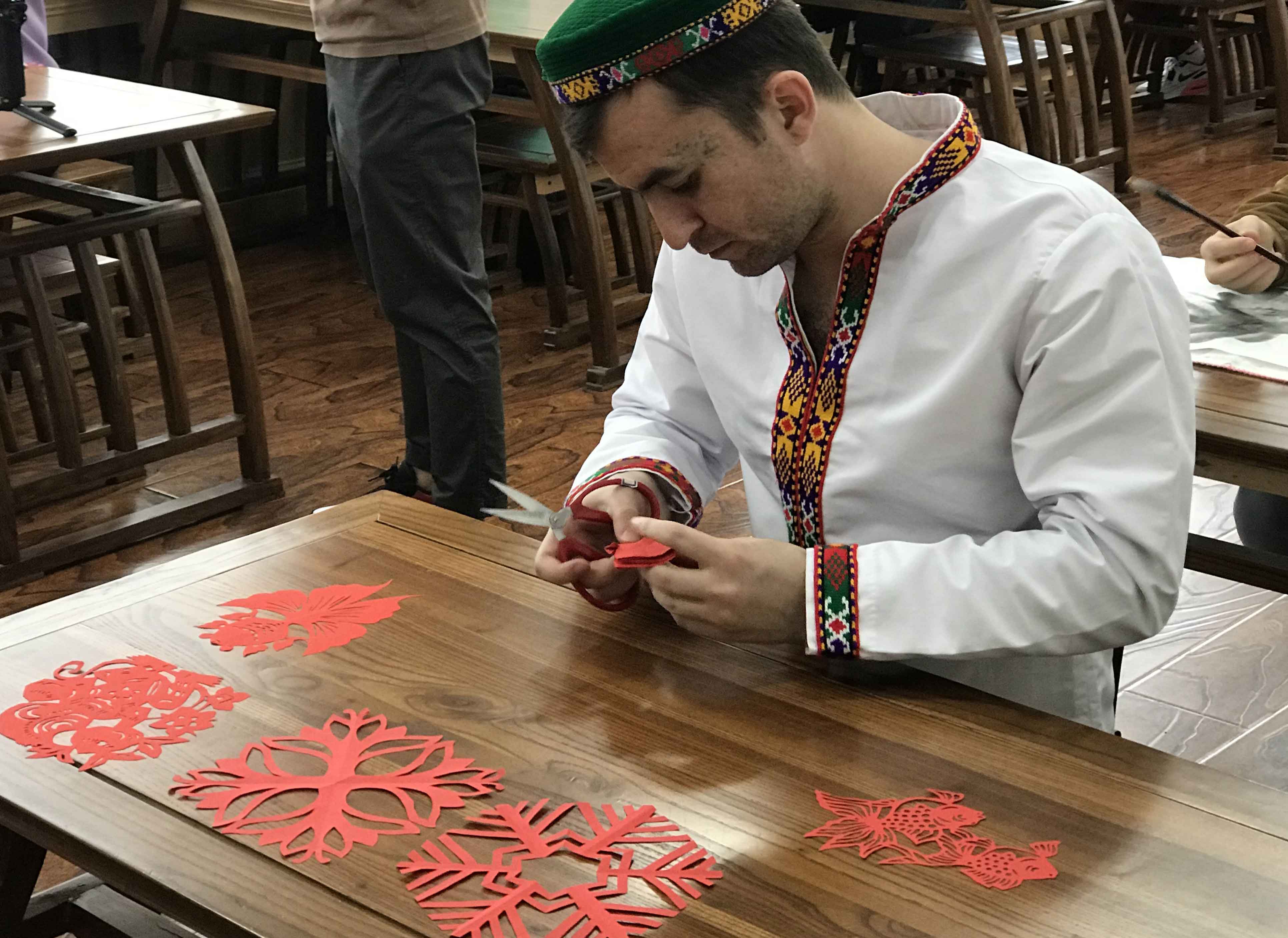 6月9日,留学生教育中心组织12名留学生近距离体验中华优秀传统文化,感知民间传统艺术的魅力。通过老师的讲解,留学生们知道了文房四宝和国画的基本技巧方法,了解了剪纸的历史起源,欣赏了各种有趣的剪纸作品。一把剪刀,一张红纸,留学生手执红剪,体验指尖上的剪纸艺术,剪出了一幅幅独出新裁的作品。