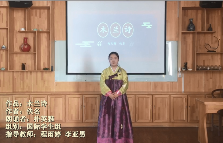 学校非常重视此项活动,由留学生教育中心安排对外汉语教学骨干师资力量选拔优秀留学生参赛。经过前期悉心指导、认真排练、视频录制,我校2个参赛作品均入围国际学生组决赛单元。最终,由教师程雨婷、李亚男指导,由朝鲜籍法学专业2021级本科留学生朴英雅(PAK YONG A)朗诵的作品《木兰诗》在全省诸多参赛作品中脱颖而出,获得“2021年辽宁省高校中外大学生中华经典外语诵读大赛”汉语(个人赛)三等奖。