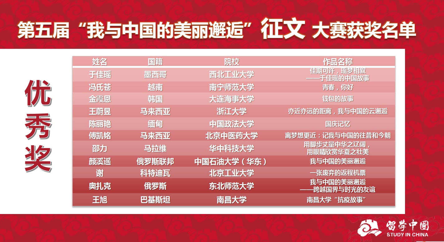 为促进不同国家青年一代的人文交流,增进外国留学生知华、友华情怀和对中国发展变化的深刻认知,展示各国来华留学生风采,发掘留学生朋友们感人至深的中国故事。由教育部国际司主办,教育部留学服务中心承办的第五届《我与中国的美丽邂逅》来华留学生征文暨短视频大赛活动于2021年12月成功落下帷幕。