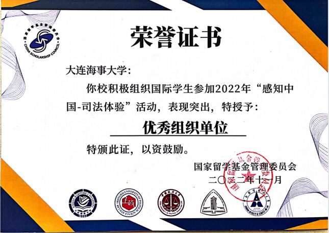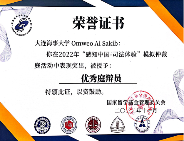 在此前由国家留学基金管理委员举办的“感知中国-司法体验”模拟仲裁庭活动中,以上两位同学凭借优异表现获得“优秀庭辩员”荣誉,我校获得“优秀组织单位”称号。