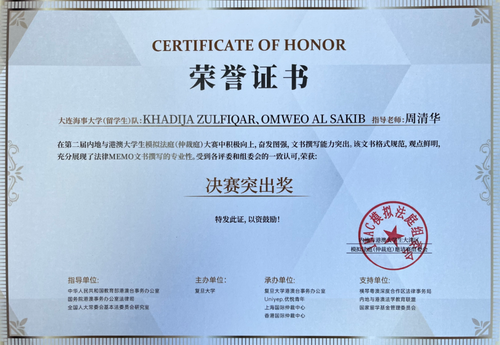 经严格筛选,共有14支代表队入围决赛并展开激烈角逐,我校由巴基斯坦籍法学专业博士留学生ZULFIQAR KHADIJA(朱馨宁)、孟加拉国籍法学专业博士留学生SAKIB OMWEO AL(奥姆)组成的代表队在法学院周清华教授指导下,在决赛中发挥出色,获得“决赛突出奖”的优异成绩,充分展现海大来华留学生的风采和素养。