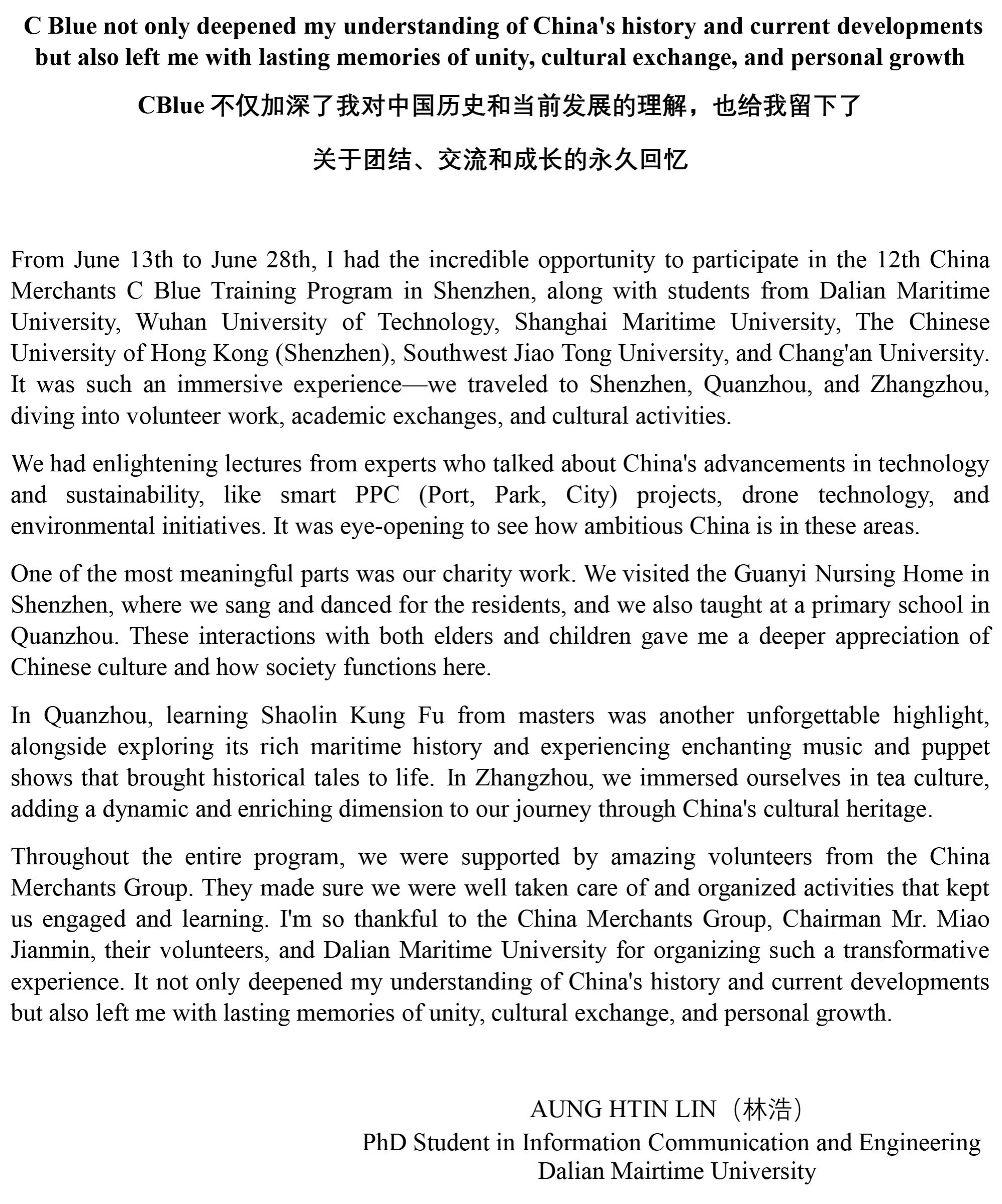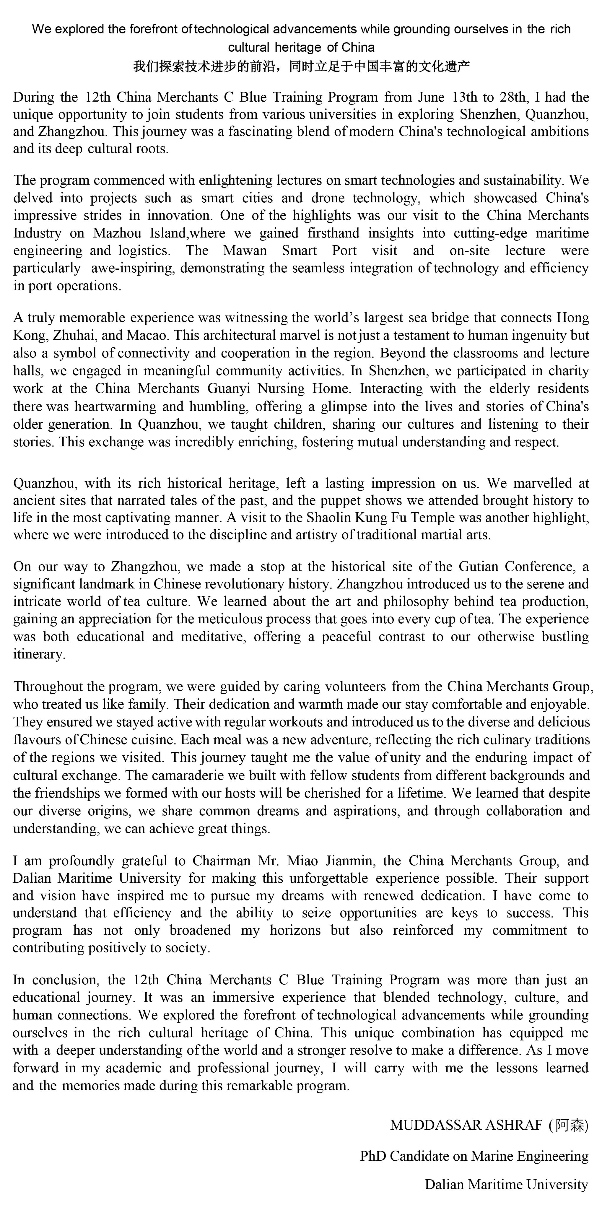 此次活动在同学们心目中留下了满满的回忆和深深的感动,他们对百年招商发展历程、中国社会历史文化、“一带一路”时代意义等有了更深入的认识和理解。他们在收获知识的同时,更收获了真挚的情感和友谊、共同凝聚起携手推动世界交通可持续发展的使命感和责任感。海大留学生也纷纷通过文字来表达参与此次活动的收获与感动,就让我们一起分享巴基斯坦籍博士生阿森和缅甸籍博士生林浩的C Blue感悟吧!