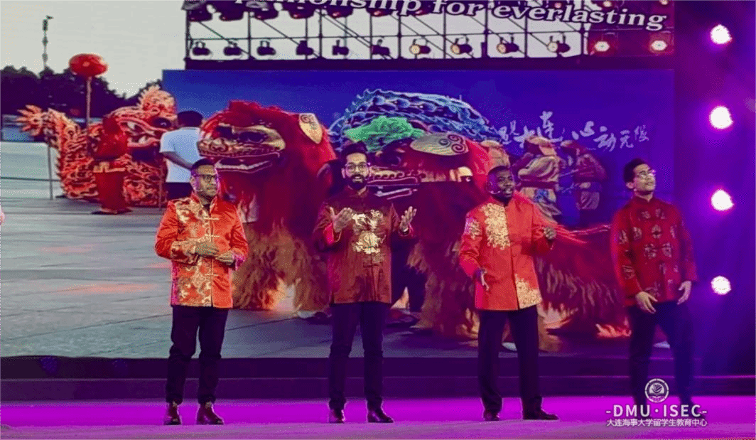 在节目展演环节,我校留学生同其他大连高校留学生代表们共同倾情献唱歌曲《相亲相爱一家人》。“因为我们是一家人,相亲相爱的一家人”,唱出了所有在连外国友人的心声,引起全场中外嘉宾的热烈共鸣,台上台下欢乐互动,将招待会画上圆满的句号。