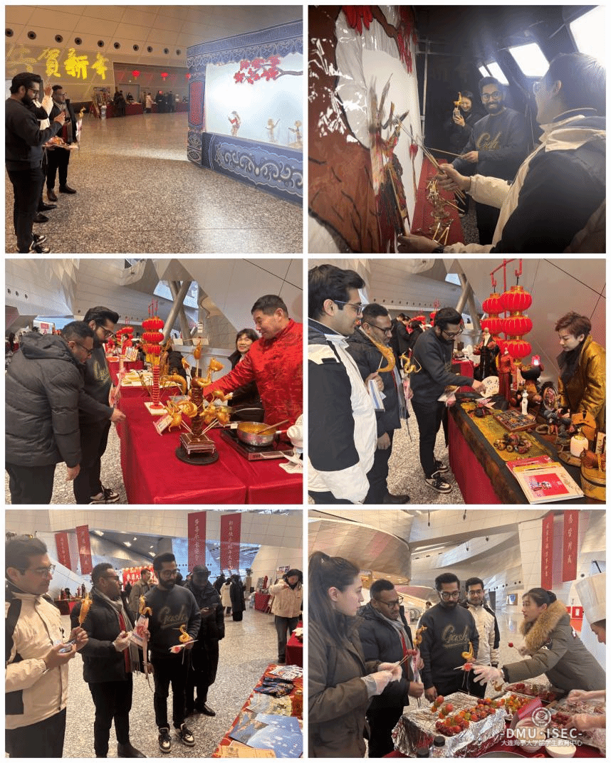 大连国际会议中心三楼张灯结彩、暖意融融,现场洋溢着浓浓的节日气氛。海大留学生同中外嘉宾们一道,观赏舞狮表演、感受非遗魅力、品尝中华美食,沉浸在浓浓的中国年味中。在非遗展区,同学们体验了皮影戏、吹糖人,在传统旗袍、大连贝雕、皮雕、鸟虫篆刻、泥塑、插花等众多非遗项目前驻足观赏、啧啧称奇。在特产展区,各区市县、开放先导区纷纷展出各自特产及文创产品,从糖葫芦、棉花糖、庄河大草莓,到长海大海参,让中外嘉宾们赞不绝口,大呼过瘾。