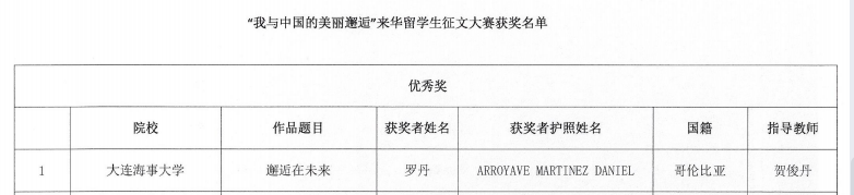 此次活动面向全体来华留学生、留华毕业生、海外院校汉学院学生学者征集征文或短视频作品,得到了国内外高校、教育机构及留学生个人的广泛关注和积极参与,经过征文比赛评委会的评审,最终评出获奖征文一等奖5篇,二等奖8篇,三等奖16篇,优秀奖31篇。我校哥伦比亚籍物流工程与管理专业硕士研究生ARROYAVE MARTINEZ DANIEL(罗丹)征文作品《邂逅在未来》(征文指导教师:贺俊丹)凭借生动流畅的描述、真挚热烈的情感、独具创新的思路荣获征文优秀奖,其作品入选由人民日报出版社出版的《我与中国的美丽邂逅》一书,并将在相关官方网站、公众号等媒介发布。