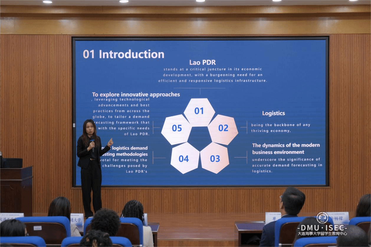 In the keynote speech segment, DMU Laotian PhD student in Logistics Engineering and Management, NAOKOUMMALY PHUANGCHANH, evaluated the current situation of logistics demand forecasting in Laos under the topic of "Research on Logistics Demand Forecasting in LAO PDR", and shared her research progress studying in China with five graduate students from other universities.