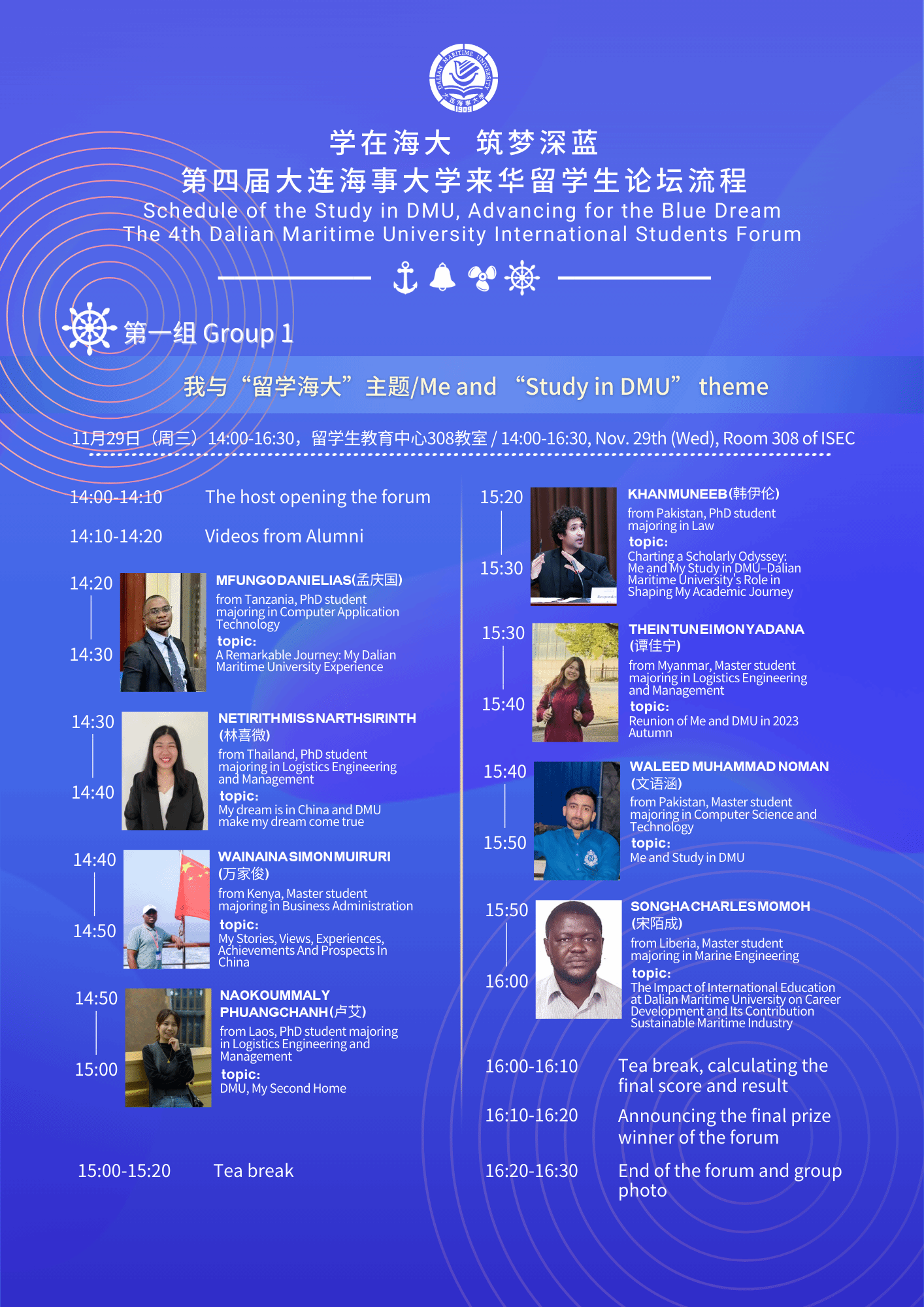In order to provide opportunities for exchange, sharing, and mutual learning among international students of DMU, set up a stage for international students to showcase themselves and exercise their abilities, encourage them to actively tell their stories with the "the Belt and Road", express their views and aspects on the sustainable development of transportation, or share the gains and growth of study in DMU, the “Study in DMU, Advancing for the Blue Dream--The 4th DMU International Students Forum” will commence on Nov. 29th, which is going to display DMU international students good spiritual outlook, as well as their sense of mission and responsibility to jointly build a community with a shared future for mankind. After preliminary submission and review, a total of 16 international students have been nominated for this forum. The specific information and arrangements are as follows: